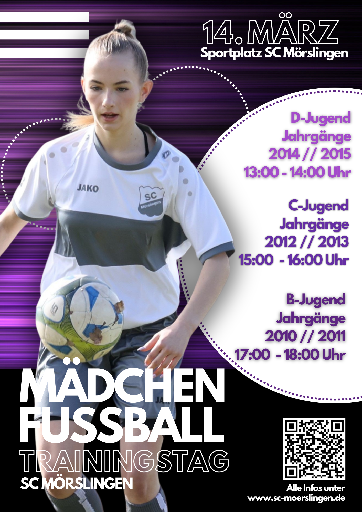 Erlebe ein spannendes Training, ein tolles Team und die perfekte Gelegenheit, dein Können zu zeigen oder einfach ganz neu in den Fußball einzusteigen.